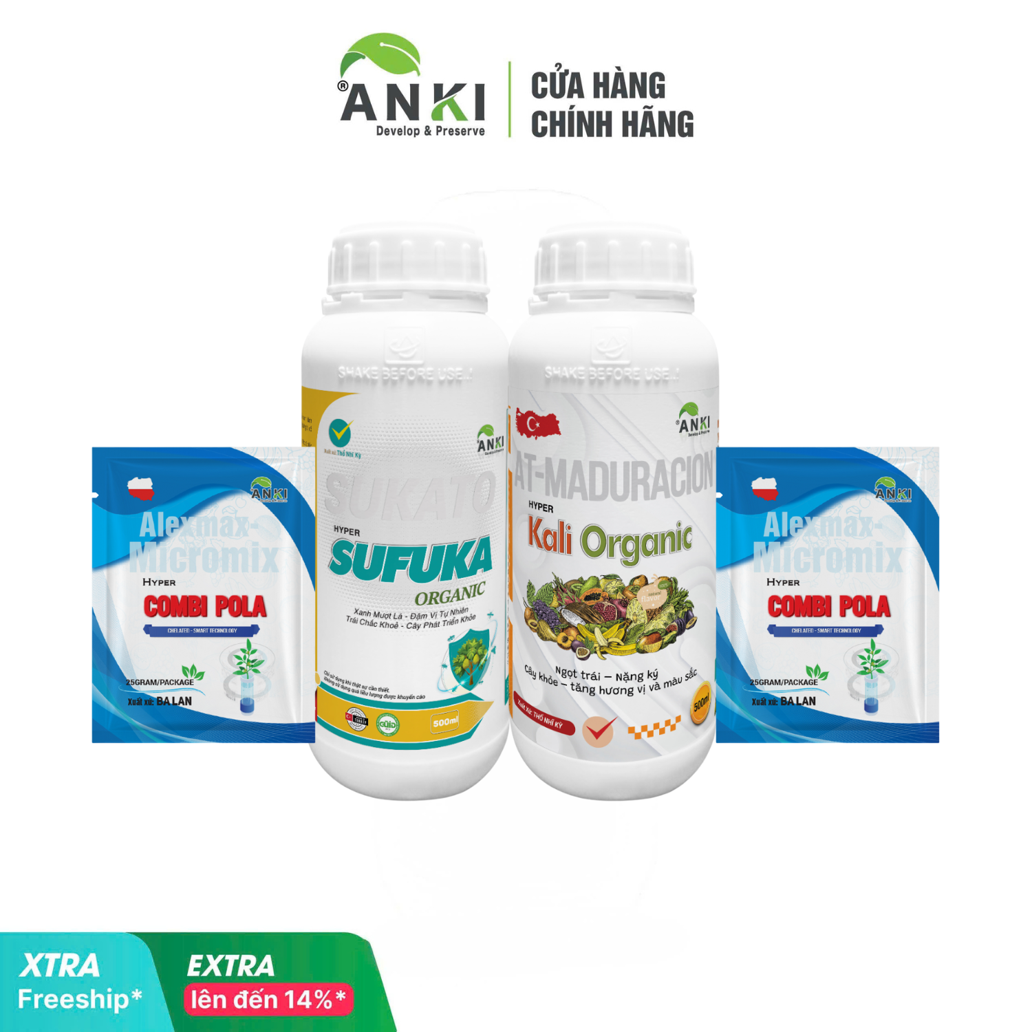 Bộ "1 chai Kali Organic 500ml +1 chai Sufuka 500ml + 2 gói Combi Pola 25gr" pha 500-600 lít nước (nên tham khảo liều dùng từ nhân viên kỹ thuật ANKI để sử dụng được hiệu quả hơn).